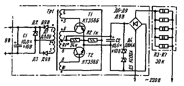 выполненный на диодах Д2, ДЗ. Выходное напряжение 9 В снимается со