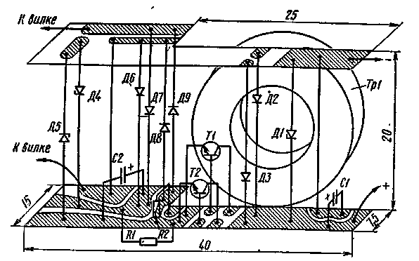 приведенной на рис. 57, напряжение сети через гасящие резисторы R3 — R7, расположенные в самодельной сетевой вилке, поступает на выпрямитель,